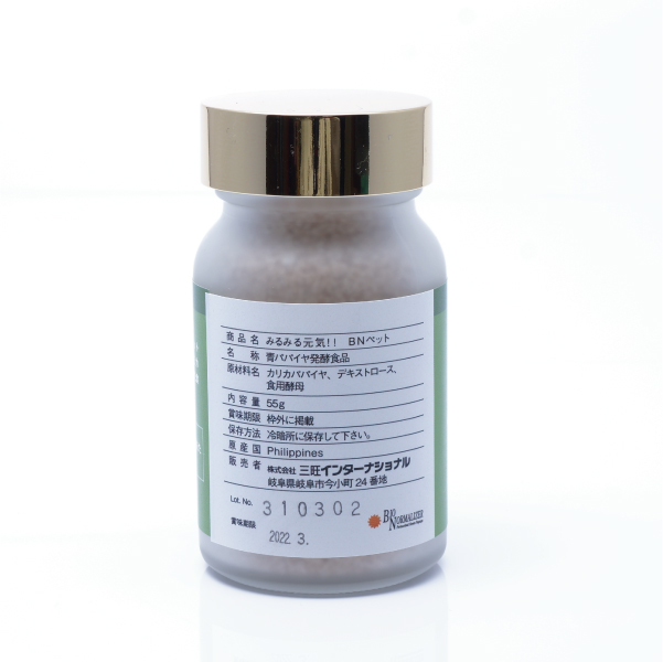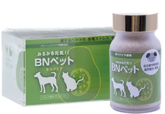 Activated oxygen is a cause of numerous diseases. The main ingredients in BN pet are green papaya, yeasts, and lactobacteria, and the fermentation effects of these materials reduce activated oxygen to appropriate levels. Improves your pet’s intrinsic immune function. The abundant citric acid and tartaric acid are also effective for reducing fatigue and improving physical recovery.
