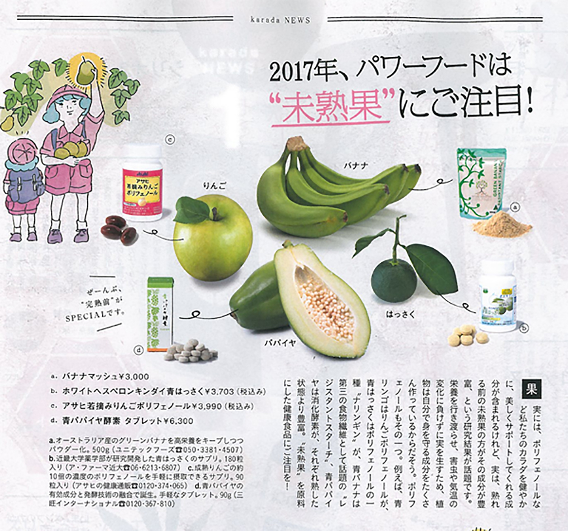 “In 2017, focus on the power food known as ‘powdered fruit juice!’” After this opening, the article went on to introduce our “green papaya enzymes” as a product made from green papaya alongside banana, hassaku orange, and apple products.