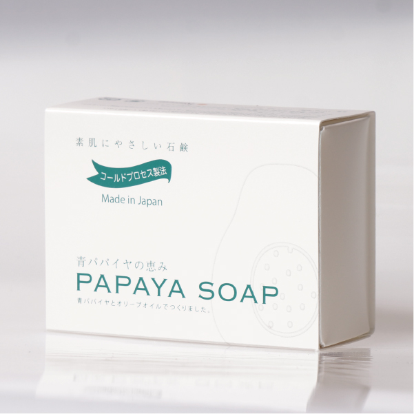 There are various different kinds of skin problems such as rough skin, scratchy skin, acne, dull skin tone, and dirt-clogged pores. The main causes of all of these problems are slowed skin replacement due to pores getting clogged with old keratin skin cells. The properties of the papain enzyme contained in green papaya enable it to break down protein, fats, and carbohydrates. These properties are used to break down old keratins, promote skin regeneration, and develop healthy skin. That’s the idea behind our “Green Papaya Blessings: Papaya Soap.”