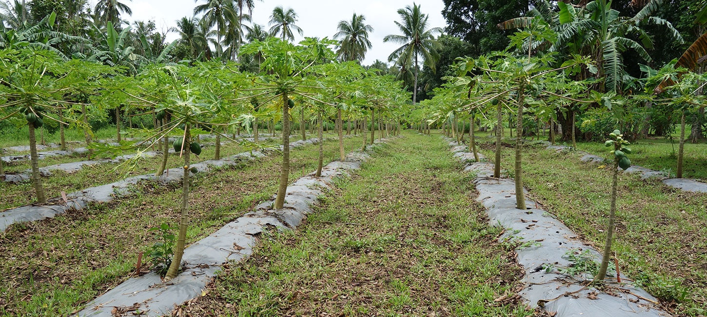 "At organic papaya farms, tall trees such as coconut and mahogany and medium-height trees such as banana, cacao, and neem are planted to protect the papayas from strong winds.