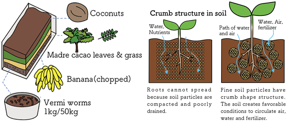 Earthworms create crumb structure in soil by processing various plants. Nitrogen produced from cocoa and large amount of potassium and phosphorus in banana help plants grow.