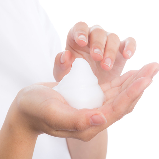 1) When fatty acids are mixed with sodium hydroxide or potassium hydroxide to cause a chemical reaction, glycerin which separates from the fatty acids is released as a byproduct. This is the reason why additive-free soap is said to dissolve easily, but it also gives the soap a beneficial moisturizing effect. Soap gives off fatty acid ions in water. These fatty acid ions immediately transform into water-insoluble fatty acids and are adsorbed by the keratinaceous surfaces of the skin. When you rinse, they are not washed away, but instead remain on the surface of your skin, providing a moisturizing effect.