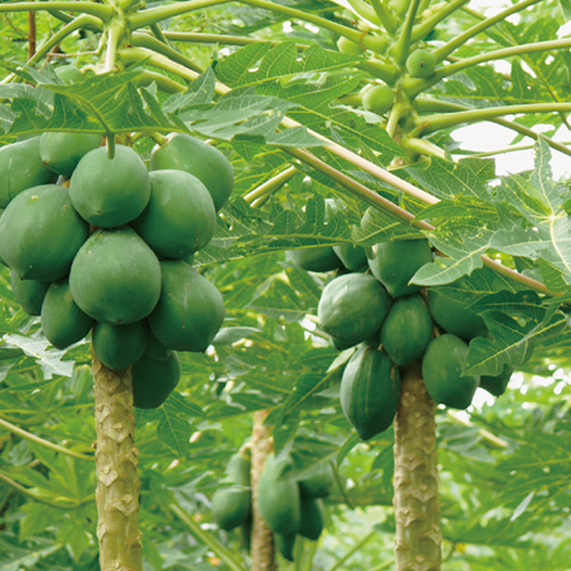 Fatty acids from plant or animal fats combined with sodium hydroxide (caustic soda) to trigger a reaction which generates “fatty acid sodium” to create sodium soap (bar soap). Potassium hydroxide (caustic potassium is added to fatty acids from plants or animals to generate “fatty acid potassium” to create potassium soap (gel or liquid soap). Fatty acid potassium is a highly water-soluble gel, and water can be added to it to convert it to a liquid. Fatty acid sodium and fatty acid potassium generated in this way are called “soap base,” and they are referred to as “soap” regardless of whether they are solid or liquid. Our papaya soap, “Blessing of Green Papaya,” is a bar type, meaning it is a sodium soap.