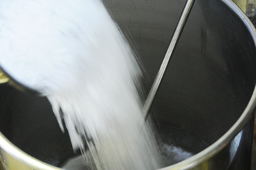 1.Sodium hydroxide and purified water and carefully measured and mixed. Since sodium hydroxide releases heat when mixed with water, the solution is allowed to cool until reaches approximately 40℃.